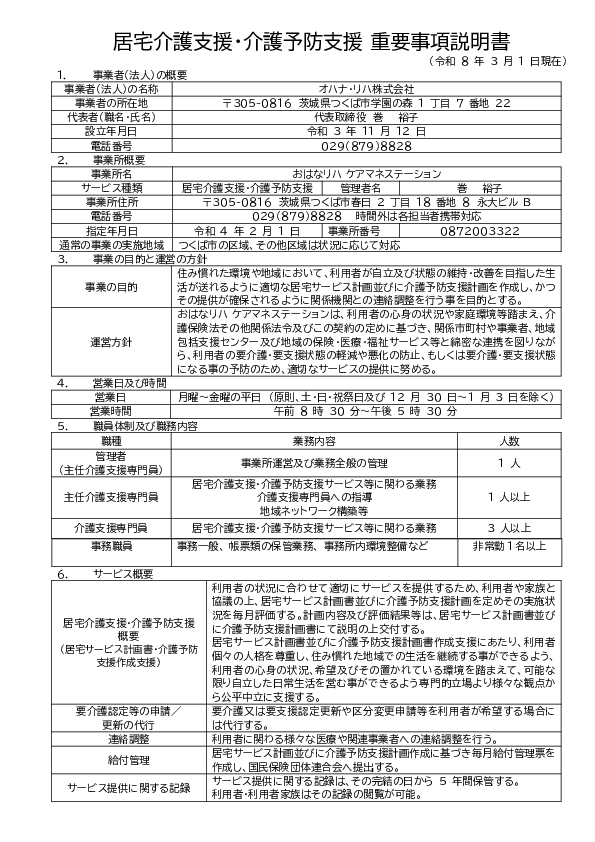 オハナ・リハ株式会社は、ケアマネジャーが在籍する「おはなリハ ケアマネステーション」と、生涯学習を提供する「おはなリハ楽習塾」を運営しており、地域に根付いた、あたたかみのあるご支援を心がけております。